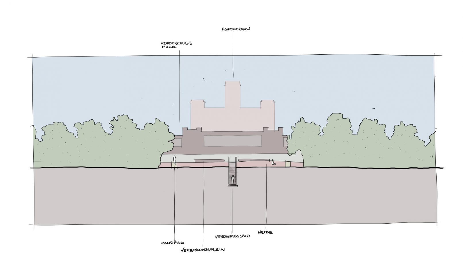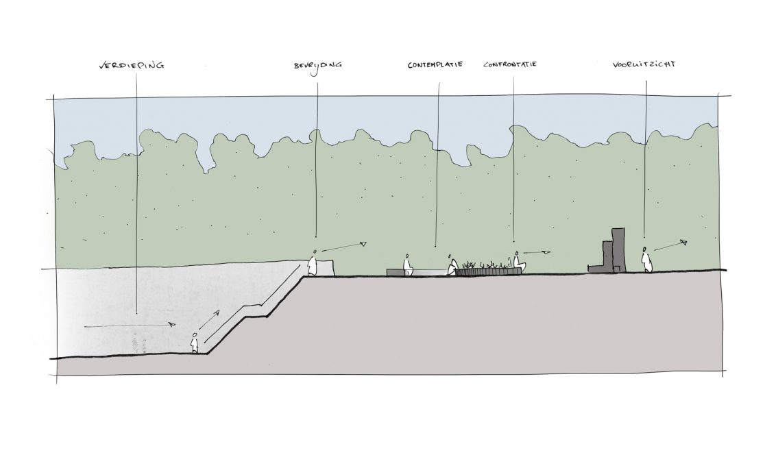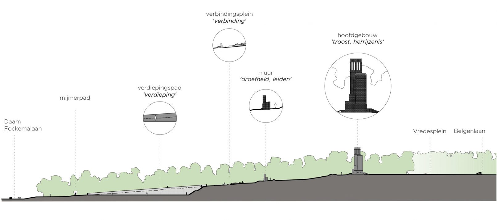Aanleiding voor de opgave is de restauratie van dit Rijksmonument. In de afgelopen honderd jaar is de oorspronkelijke ervaring van het monument verloren gegaan. Het monument wordt nu benaderd via de achterzijde. Om deze ervaring weer in ere te herstellen wordt de benadering via het oorspronkelijke S-vormige pad weer mogelijk gemaakt. Door op deze route, in lijn met het bestaande monument, een ruimtelijk object toe te voegen krijgt de plek op een nieuwe, eigentijdse manier betekenis als herdenkingsplek voor ontheemden.